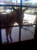 "Oh what a blast it has been spent letting Charles check out his new home.. He has decided he likes Moses and thinks he may like Bubby lol…:O) He is very inquisitive and wants to check EVERYTHING out even the camera!! He is forever coming to the back door and peeking in as if to say heyyyyy anybody gonna let me in??? Mike and him have already been going head to head and loving up on each other!!! What an awesome bond Charles is bringing to the whole ranch…:O)"